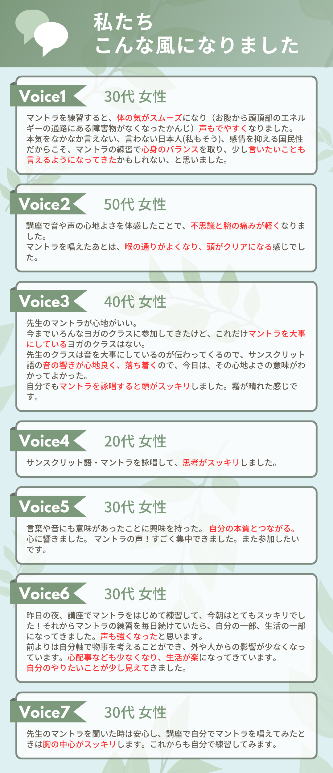 【マントラ】を唱えることで呼吸や声の使い方を学び、自分本来の『声』をいつでも出せるような方法をお伝えしていきます。